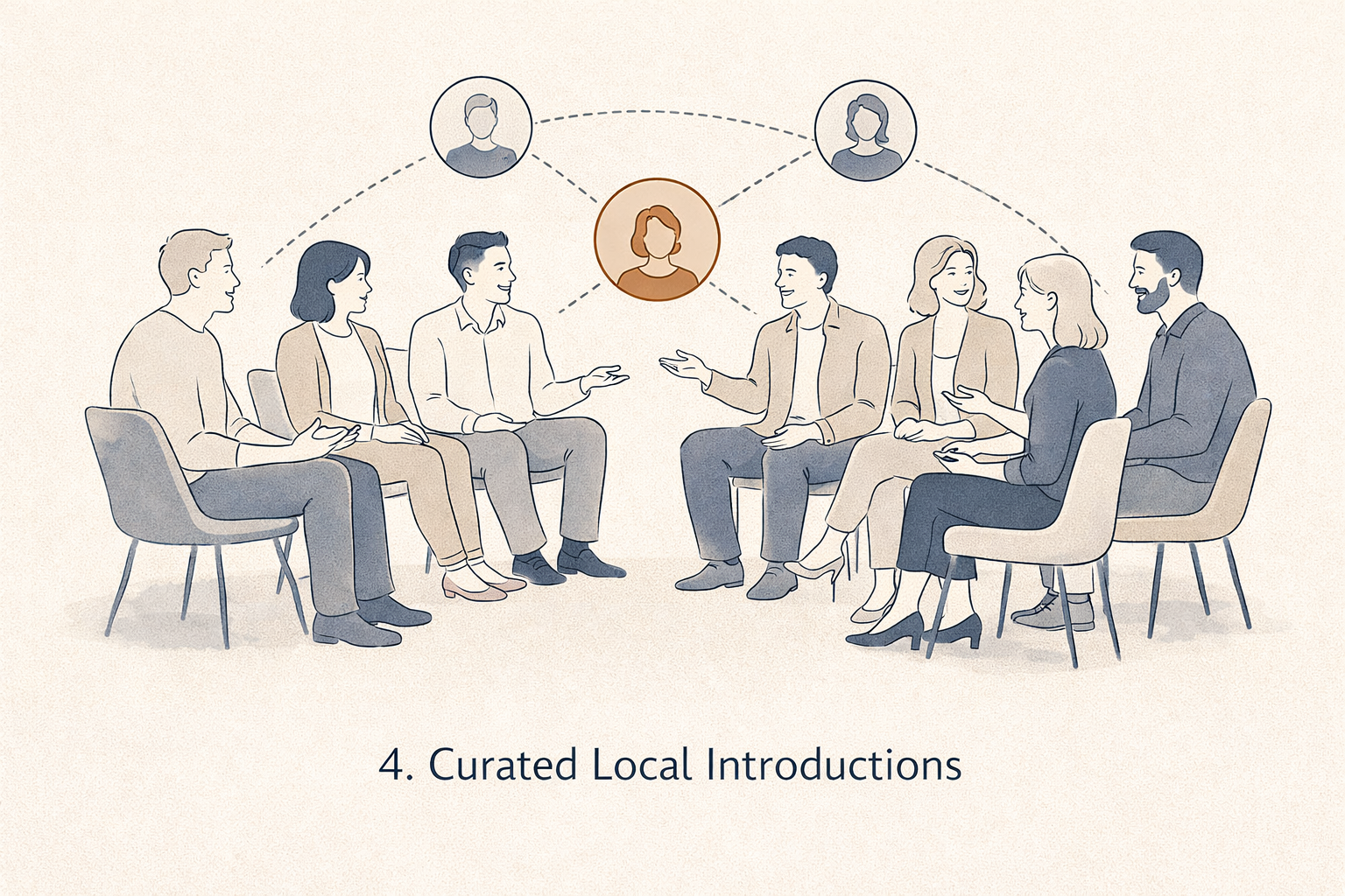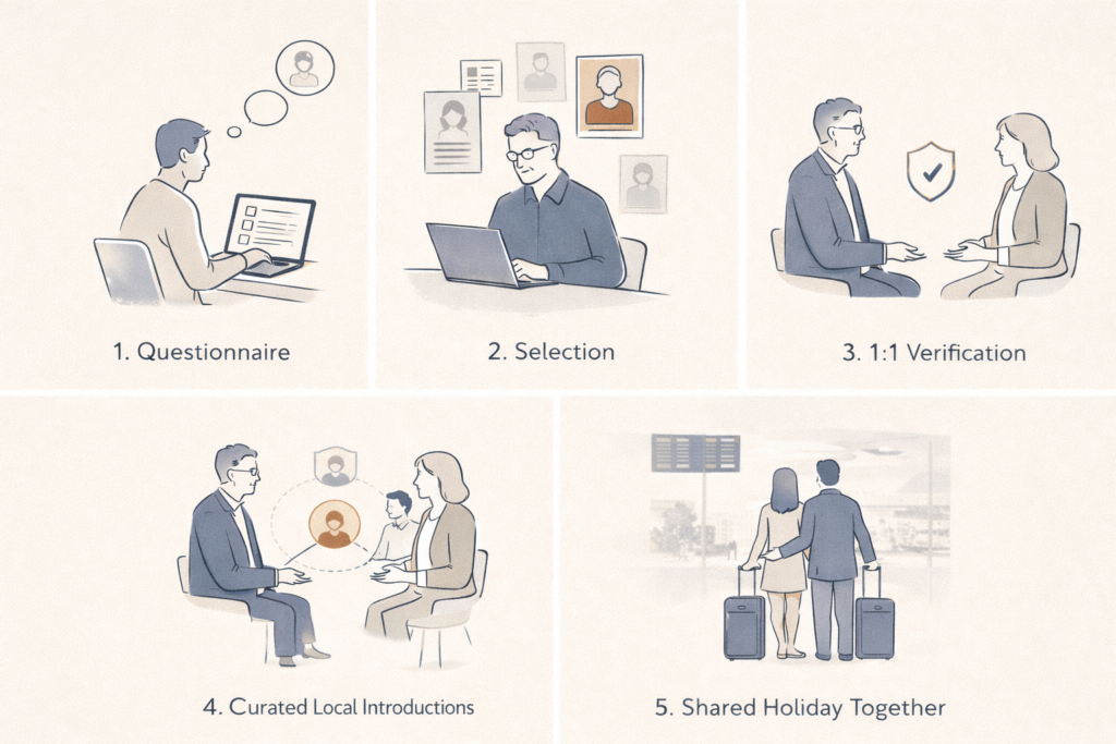 Selected participants who share meaningful common ground and genuine compatibility are invited to thoughtfully organized online and offline gatherings prior to any shared travel experience.